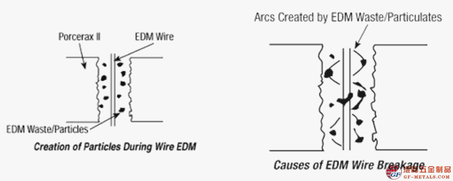 上图显示线切割过程中产生的电弧如何携带微粒,增加绕线速度不仅大大降低了断线的可能性也减少了加工时间。