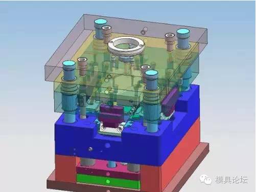 滤油器部件由4个不同形状的部件重叠而成。其中,2个部件的成形与4个部件的组装采用同一个级进模。